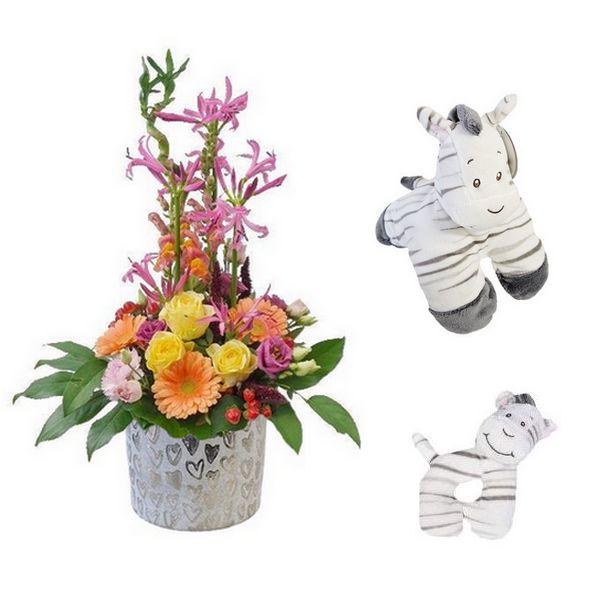 Le Coffret Bienvenue Zèbre se compose d’un jolie choix de fleurs de saison multicolores, dans une splendide coupe en céramique, accompagné d’un hochet, et d’un doudou Zèbre.