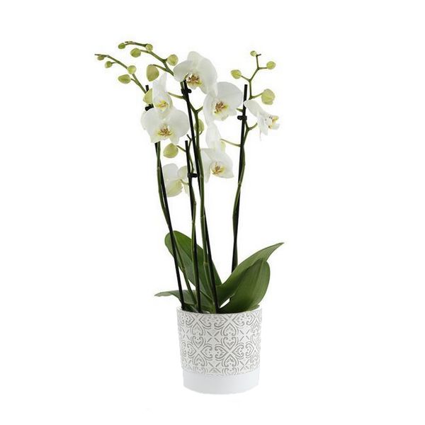 Orchidée blanche à 3 tiges avec son cache-pot.