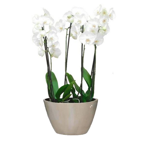 La terrine de 2 orchidées blanche se compose de 2 orchidées blanches à 3 tiges chacune avec son splendide cache-pot adapté.