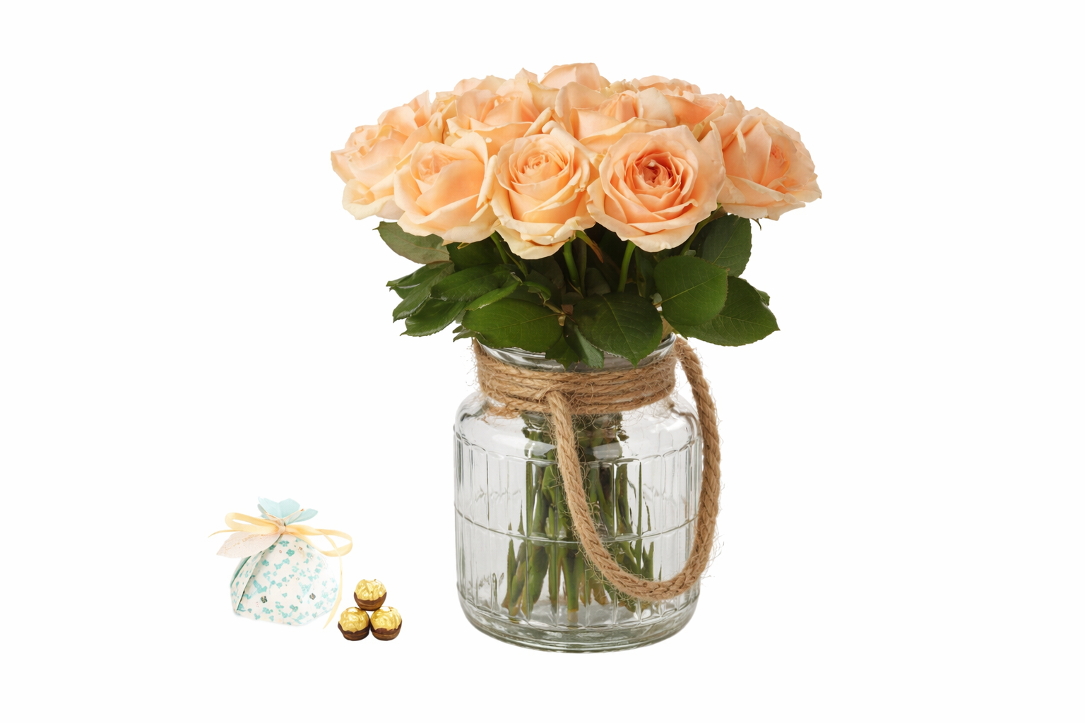 Le trio Rose Pearl se compose de 20pc de rose crème à bouton moyen, dans son vase charmant vase adapté inclus, et accompagné d’une gourmandise 3 Ferreros.